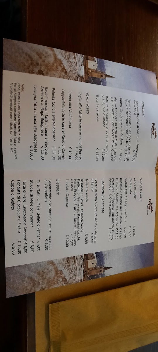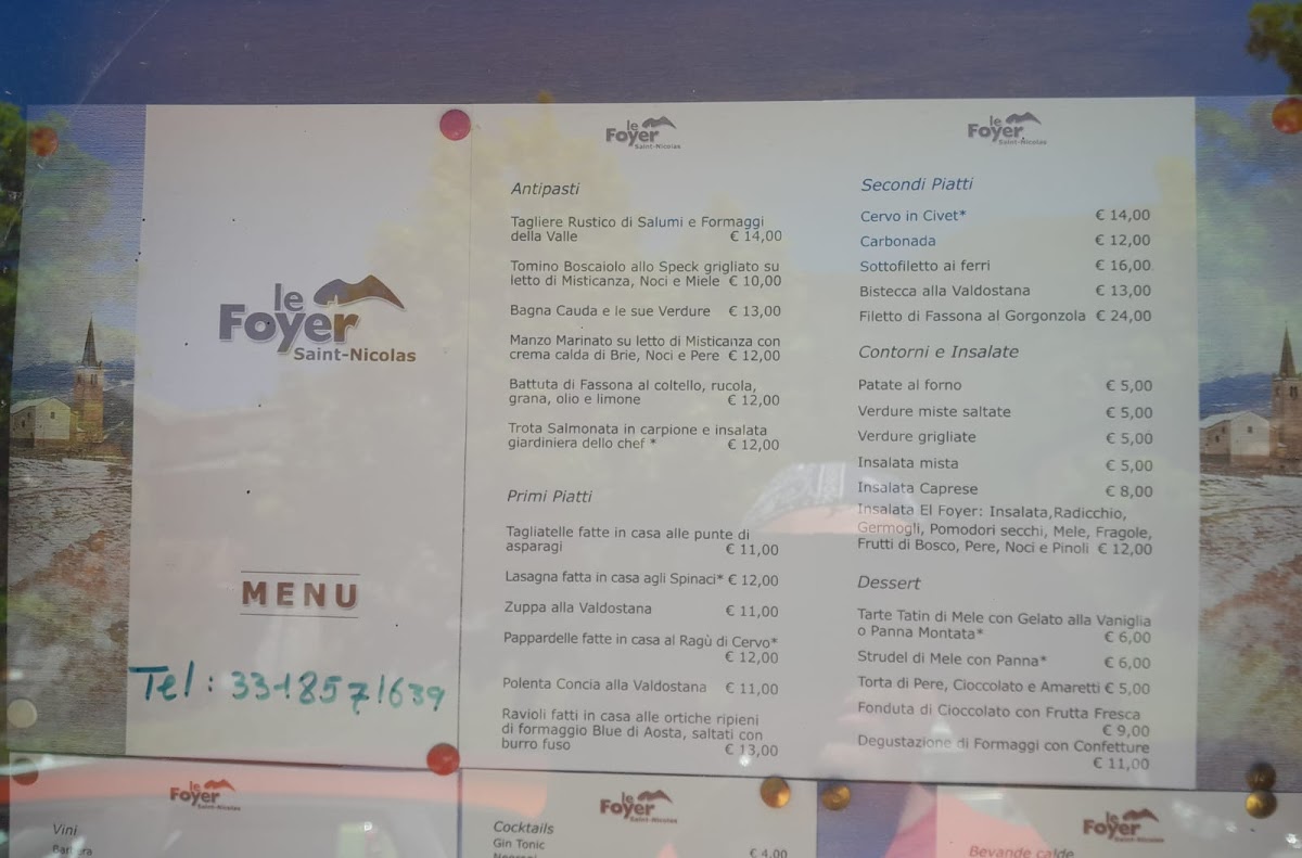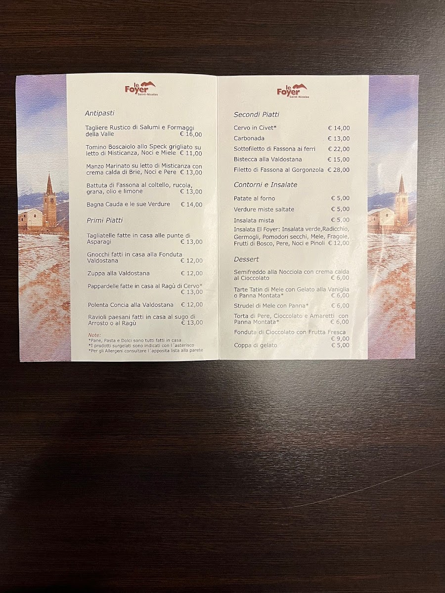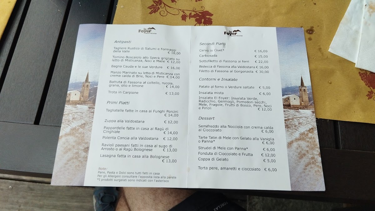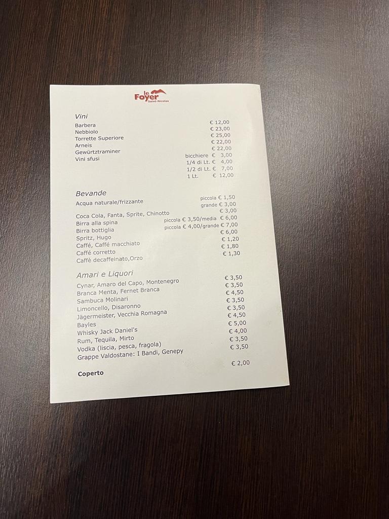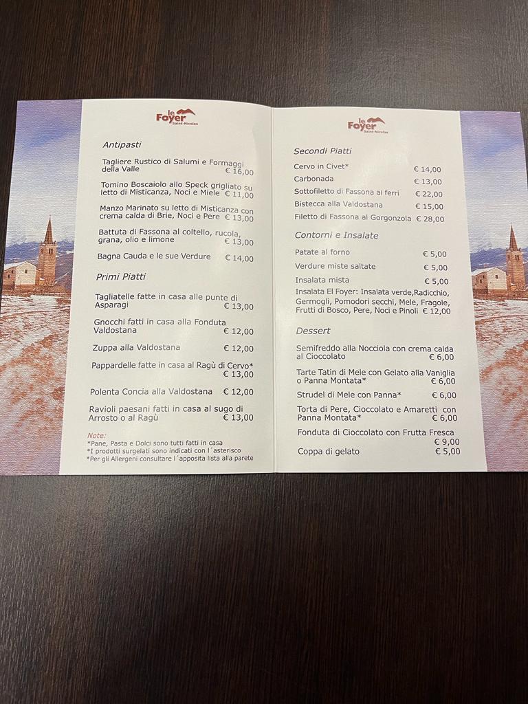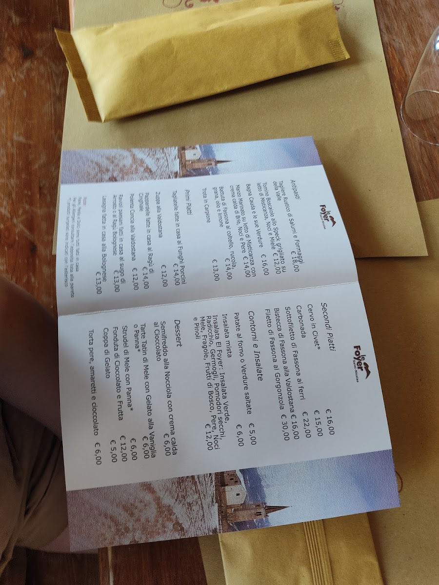 The menu at Le Foyer Du Fond offers a delightful selection of traditional Italian dishes, with a special focus on regional specialties from the Aosta Valley. The Polenta Concia stands out as a comforting dish, featuring creamy polenta paired with rich cheese, making it a perfect choice for those craving a hearty start to their meal. For dessert, the Fonduta Di Cioccolato Con Frutta offers a decadent experience, with warm chocolate fondue served alongside fresh fruit, ideal for indulging in the sweet flavors of the region.
